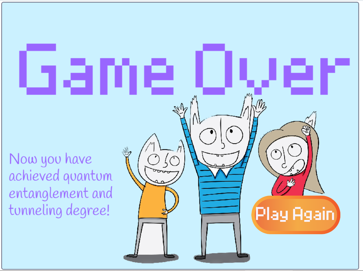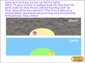 The game is in two parts - entanglement and tunneling. It teaches players essential quantum concepts while having fun with the easy-peasy games. To begin, press the "1" or "2" button to learn about Quantum Entanglement & Quantum Tunneling respectively.