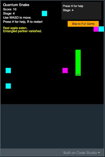Quantum Snake uses two quantum apples that start in a pair. Both apples are visible (superposition) and don't move until the snake approaches one. Getting close counts as a measurement, randomly selecting which apple is real and which is fake. The fake apple disappears, while the real apple turns green and acts like a traditional snake apple that grows the snake and increases the score.