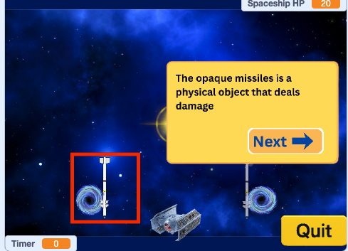A spaceship game where you must dodge incoming missiles. The game involves superposition and measurement when the ship touches the translucent missiles and has a tunneling system: if you fly into one portal, you instantly teleport to the other. There’s also an energy ball — when you touch it, all missiles explode at once (entanglement). You control the spaceship using the W, A, S, and D keys.